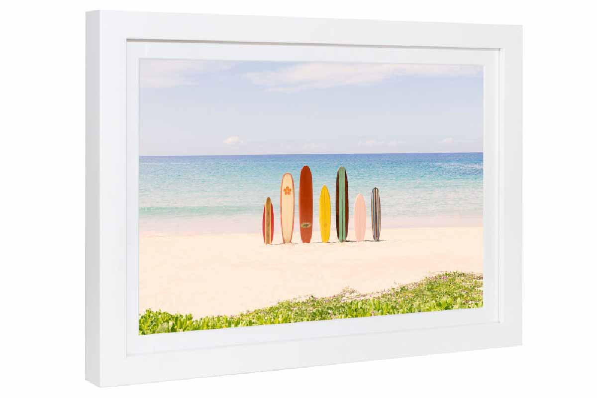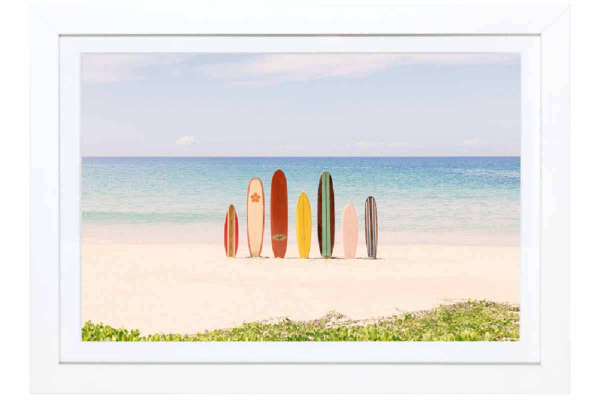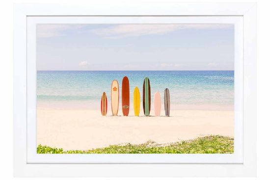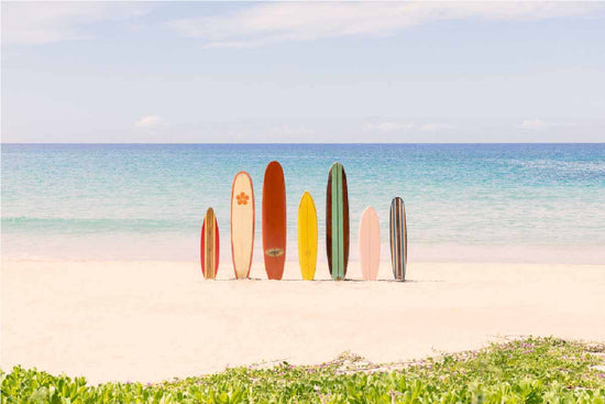 Get ready to catch some waves in SURF'S UP, MAUNA KEA from the series Gray Malin at the Mauna Kea. Inspired by the timeless and unique spirit of the island of Hawai’i, Gray photographed this collection at the beloved Mauna Kea Beach Hotel. Vintage props, colorful surfboards, and striped beachside umbrellas decorate eye-catching locations throughout the historic 1960’s property, built by Laurance S. Rockefeller. This series celebrates the idyllic island lifestyle and transports you to a tropical paradise along the shores of Kauna’oa Bay.